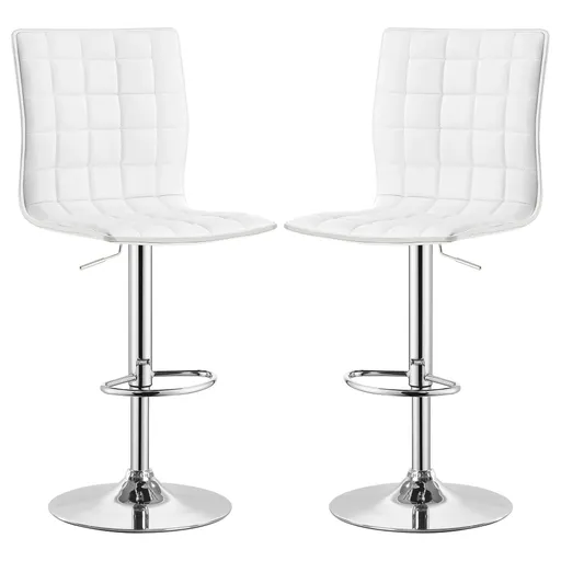 Gleaming chrome accentuates the clean, modern silhouette of this adjustable barstool. Its armless seat boasts a full back with waffle texturing created with intersecting lines for a dimensional look. Delivering appealing comfort, the barstool includes a height adjustable seat that accommodates various counters and bar tables. Cool white upholstery with a leather-like look reinforces a clean, contemporary profile. A pedestal base shows off a gleaming chrome finish and includes a built-in footrest for optimal comfort.Includes: Two (2) adjustable bar stools