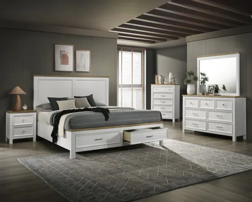 Discover the perfect blend of style and functionality with this elegant bedroom ensemble, designed to transform your space into a serene retreat. The crisp white finish, paired with sophisticated details, creates an inviting atmosphere. A standout feature is the storage drawers in the footboard, providing convenient and discreet space for linens or essentials, enhancing both organization and style. Each piece in this collection is crafted to offer timeless elegance and modern practicality, making it an ideal choice for those seeking a harmonious balance in their living environment.. Natural wood finish top Dovetail drawer construction Paneled design