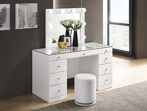Step into a world of glamour with this sleek and chic vanity set, a perfect fusion of functionality and fashion. Its glossy white finish and clean lines are complemented by the sparkle of crystal-like knobs, adding a touch of sophistication to your personal space. The spacious tabletop, graced with a large mirror surrounded by radiant lights, offers an ideal stage for beauty routines, ensuring flawless makeup application under impeccable lighting. With a variety of drawers, this vanity provides ample storage to keep essentials organized and within reach. The stool with its luxurious upholstery provides a comfortable seat that rounds out this vanity set, making it a must-have for those who appreciate a touch of luxury in their daily life.. Ball bearing drawer glides 3 shallow upper drawers 6 side drawers