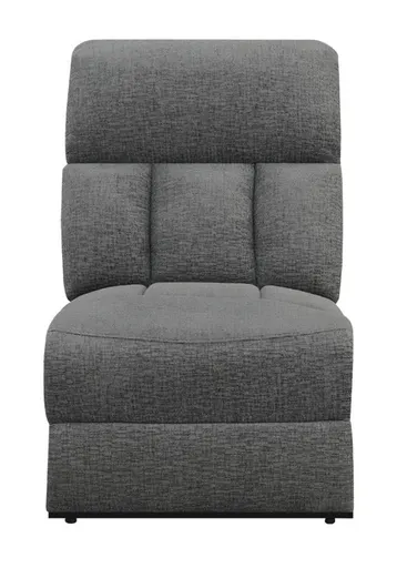 Designed for seamless modular integration, this armless chair expands seating space while maintaining a cohesive look. Upholstered in soft charcoal fabric, it features plush padding and a channel-tufted backrest for enhanced comfort. With a non-reclining design, it offers firm and supportive seating, making it an excellent addition to any sectional configuration. Built for durability, it ensures lasting stability and comfort.Includes: One (1) armless chair• Armless chair for modular sectional configurations • Charcoal fabric upholstery provides a soft, inviting feel • Channel-tufted backrest enhances support and comfort • Non-reclining design offers firm and stable seating • Plush cushioning ensures a cozy and supportive experience • Durable construction for long-lasting use