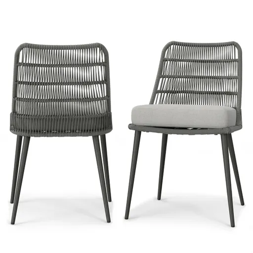 Handcrafted with top quality powder coated aluminim, rope, polyester fabric and high density foam. Chair frame, base and legs are built with rust resistant aluminim finished with a powder coated finish in Grey. The curved back and seat frame are wrapped with highly durable woven rope cording, woven webbed seat for maximum support. Supremely comfortable,3-inch-thick removable cushions are upholstered in weather-resistant, premium grey woven polyester fabric. Sold in a set of 2, Pair with the Beachside Outdoor Extendable Dining Table for the perfect backyard arrangement. Contemporary Styling. Cover or store indoors during inclement weather.