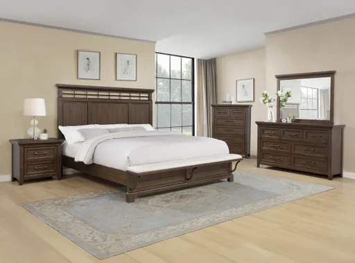 Create a serene and inviting sanctuary with this beautifully crafted bedroom collection, designed to blend timeless elegance with modern comfort. The rich wood finish, highlighted by sleek paneling details, adds warmth and character to your space. The large, comfortable bed is the focal point, complemented by matching dressers and a high-profile chest, all featuring ample storage and durable construction. This cohesive ensemble transforms your personal space into a peaceful retreat where craftsmanship meets sophisticated design..Dovetail drawer construction Kenlin drawer guides Statement hardware
