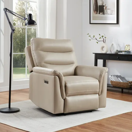 Relax in style with the Beige Dual Power Recliner, designed for personalized comfort and modern convenience. This chair features both a power headrest and a power footrest, allowing you to adjust each independently for the perfect lounging position. Upholstered in soft, durable fabric with contrast stitching, it offers a sleek, contemporary look that complements any living space. The pocketed coil seat cushions and D2550 high-density foam deliver lasting support, while the padded sides and back add extra comfort. A side-mounted control panel makes adjustments effortless, so you can sit back and unwind with ease.