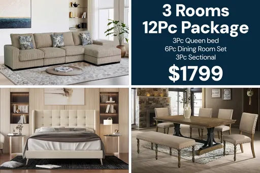 Outfit three key rooms in one coordinated purchase. This 12-piece 3-room package delivers a warm, inviting look with soft beige upholstery, clean transitional lines, and a dining set that’s made for everyday meals and weekend hosting. The tufted upholstered queen bed adds a polished, hotel-inspired feel, the roomy 3-piece sectional creates a comfortable gathering spot, and the 6-piece dining set with bench gives you flexible seating for family and friends.