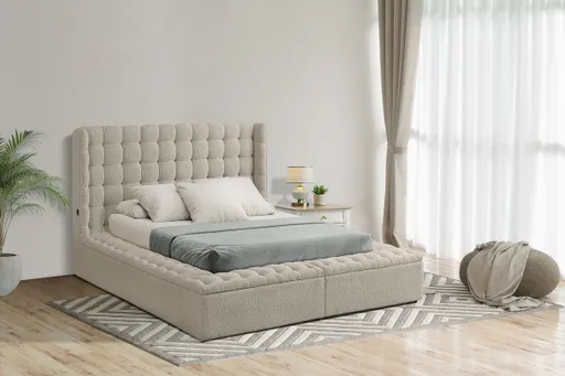 Create a cozy, designer-inspired retreat with this beige upholstered bed featuring a tall, grid-tufted headboard and fully padded frame. Soft, textured fabric and clean lines give your bedroom a warm, modern look while built-in USB ports keep your devices conveniently charged.