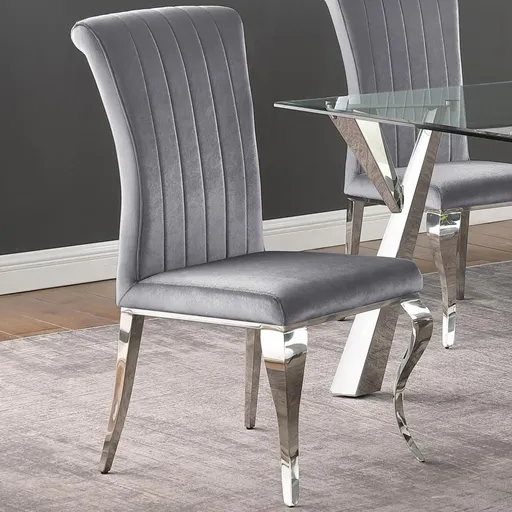 Elegant and ultra-glamorous, this upholstered dining chair offers a mixed material design that is made to last and perfect for formal dining rooms. Each chair features a stainless steel base and legs with a gleaming, shiny chrome finish. Cabriole-inspired curved legs in front add a traditional flair. Sit back and relax into channel tufted upholstery, complete with a tall backrest that rolls toward the top. Wrapped in a plush velvet fabric, these chairs are inviting and soft to the touch, and are offered in four different colors to accompany the Carone collection dining table.Product Features