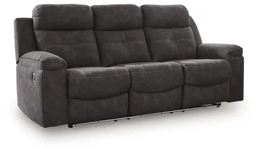 Seamlessly blend contemporary aesthetics and uncompromising comfort with this reclining sofa. Its handsome charcoal-hued faux leather has a tailored appeal thanks to sizable stitching details. As for modern convenience? The simple one-pull reclining and ambient LED lighting encourage you to relax in style.