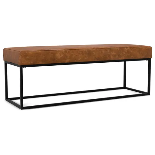 Dimensions: 18D x 56W x 18.5H inches offers generous seating with a sleek low profile Genuine Leather: Upholstered in premium tan full-grain leather for lasting luxury Natural Characteristics: Unique color tones, marks, and textures reflect authentic handcrafted quality Superior Comfort: High-density foam cushion provides plush yet supportive seating Contemporary Design: Ribbed stitching adds refined texture and modern visual appeal Sturdy Metal Base: Black powder-coated frame supports up to 250 lbs with lasting durability Versatile Function: Serves as entryway bench, bedroom seat, or stylish coffee table alternative