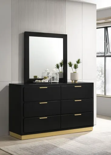 Unveil the essence of minimalism and modern luxury with our sleek six-drawer dresser and matching mirror, a perfect addition to both master and guest bedrooms. The clean lines and Mid-Century Modern flair of the dresser blend seamlessly with its straight handles and matching base, offering spacious storage with a refined aesthetic. Its smooth center glides ensure functionality without compromising on style. The accompanying mirror, framed with the same care and precision, extends the look upward, adding height and elegance to your space. This duo, versatile and sophisticated, pulls together a statement-making ensemble that transcends style trends with enduring simplicity.