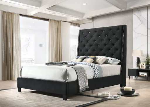 Indulge in the elegance and regal charm of our luxurious upholstered bed frame. Wrapped in a sophisticated black velvet, this bed frame features a plush, tufted headboard with subtle nailhead accents, offering a touch of luxury for any modern bedroom. Its commanding high-backed headboard is an invitation to lean back and relax.. Fully upholstered Crystal button tufted Winged sides