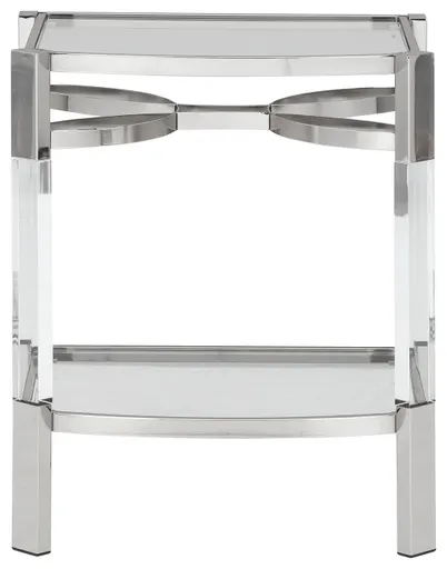 If you love the idea of total transparency, this accent table is surely a sight for sore eyes. Crafted of clear acrylic, the glass top and open glass shelf is beautifully on trend. Sleek chrome plated metal legs with clear acrylic accents add a touch of elegance to your mid-mod vibe.