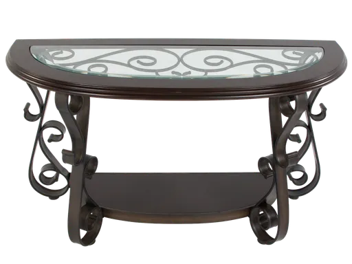 Elevate your entryway or living room with this Elegant Console Sofa Table, crafted with a rich dark wood finish and accented by a stunning glass inlay top. The table features graceful curved metal legs with artistic scrollwork, delivering a sophisticated and timeless look. Its spacious surface is ideal for displaying decorative vases, photo frames, or lamps, while the lower shelf provides additional space for books or accent pieces. This sofa table blends seamlessly with classic, transitional, or contemporary décor styles and makes a statement in any setting.
