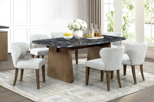 From daily meals to special occasions, this dining room set is designed for both beauty and function. The contrast of the warm walnut brown finish, black marble-look top, and light gray upholstered seating gives the room a polished, upscale feel without sacrificing comfort. Whether you are furnishing a formal dining space or updating an open-concept dining area, this set offers a timeless look with modern appeal.