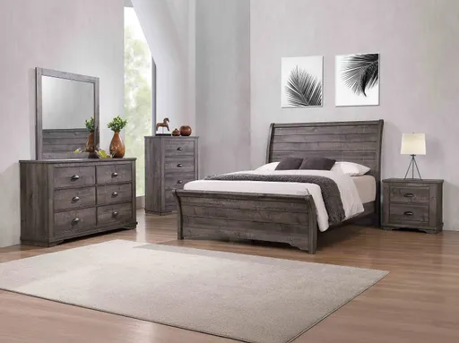 This bedroom collection brings a touch of understated elegance to your sanctuary with its soothing, contemporary design. The bed, with its clean, horizontal lines and a gently sloped headboard, provides a modern yet timeless aesthetic that encourages rest and relaxation. Accompanied by a dresser with a complementary framed mirror, a tall chest, and a nightstand, each piece is finished in a subtle gray that enhances the natural beauty of the wood grain. The black metal pulls add a refined detail, seamlessly blending with the collection's serene and sophisticated feel. .Melamine top Kenlin drawer guides Dovetail drawer construction Cup pulls