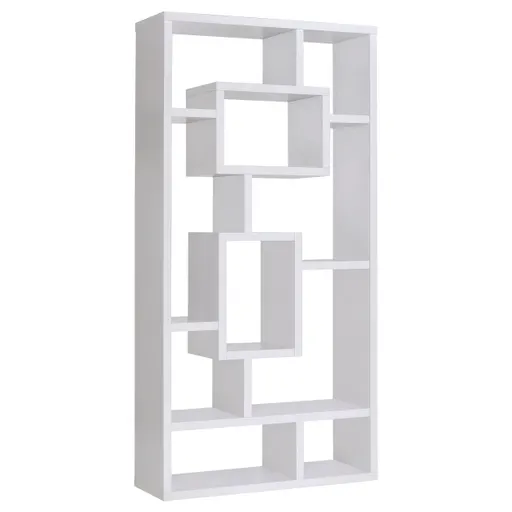 Put your most cherished memories on proud display. This bold bookcase features ten shelves of various sizes to show off your favorite keepsakes. With expert craftsmanship and high-quality materials, it provides safe, sturdy storage. Its cool, contemporary silhouette adds artsy appeal to a room with its striking, geometric shapes. This bookcase is available in white, cappuccino, or weathered grey for a variety of options to fit any decor.Includes: One (1) bookshelf• Geometric ten-shelf bookcase in white for modern display and organization • Asymmetrical shelving accommodates books, art, and everyday items • Engineered wood core with scratch-resistant laminate veneer • Vertical structure maximizes display while conserving floor space • White finish offers a versatile base for color styling or neutral tones • Includes tip-over restraint hardware for safe wall mountingDimensionsBookshelf: 35.5" x 11.5" x 70.75", Weight: 75.9