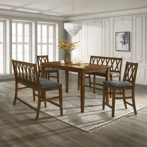 Elevate your dining experience with this stylish 5-piece counter height dining set, designed for both comfort and sophistication. The set includes a spacious 59-inch pub table, two side chairs, and two pub benches with cross-back detailing. Crafted from solid Hevea wood and MDF with a warm medium brown finish, the table offers lasting durability and a modern rustic look. The chairs and benches feature plush grey upholstered seats for added comfort, making this set perfect for everyday meals or entertaining guests.
