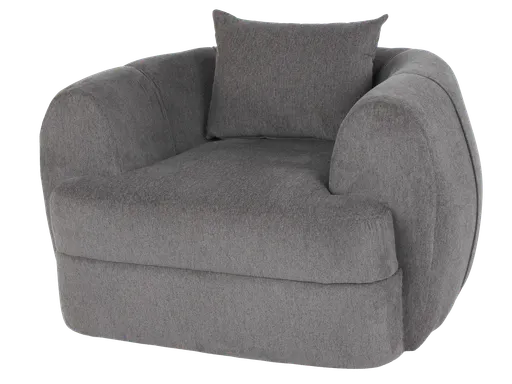 Curve into comfort. This generously scaled barrel-style swivel chair wraps you in a soft, heathered dark grey fabric with sculpted, rounded arms and a supportive, lounge-depth seat. Tailored channel seams on the back add quiet detail, while the smooth swivel base lets you turn with the conversation or face the TV without moving the chair. Designed to pair perfectly with the matching sectional and patterned ottoman from the same collection (sold separately), it brings modern, cozy style to living rooms, lofts, or media spaces.