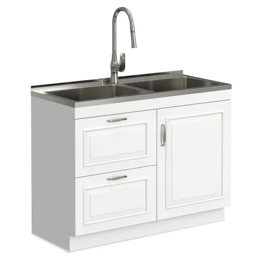 Dual Sinks: 10-inch deep 20-gauge stainless steel sinks with back splash for versatile cleaning tasks Durable Materials: Melamine cabinet with PVC-wrapped doors resist moisture and require minimal upkeep Spacious Storage: Two shaker-style doors with nickel hardware open to generous interior space Pull-Out Faucet: High-arch single lever chrome faucet with on/off spray function, cUPC certified Easy Assembly: Plumbing components and step-by-step instructions included for straightforward setup Functional Design: Ideal for laundry, workshop, garage, or basement use with efficient workflow integration Water Resistant: Premium construction withstands damp environments without warping or damage