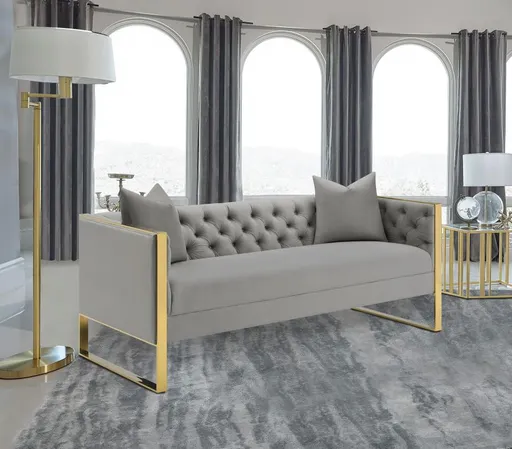 This visual appeal of this modern two-tone sofa will grab you, but it's the cozy comfort that will have you falling head over heels. First to catch your eye is the button tufted velvet upholstery in a cool light grey finish, which is as soft to the touch as alluring to the eye. Two included throw pillows will have you looking forward to your next nap, as well. Next to catch your attention is the gold stainless steel base that wraps around the arms and acts as U-shaped legs. This mix of gold metal and soft grey fabric come together in a sofa that will become a classic gathering place in no time.Includes: One (1) sofa• Sofa features a shelter backrest with button tufted velvet upholstery • Finished in light grey with gold stainless steel arms and U-shaped legs • Includes two matching throw pillows for added comfort • Tight waterfall bench seat offers a structured, modern look • Wrapped in soft velvet for a glamorous seating experience • Built on a solid frame with larch wood and plywood support