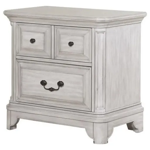 This nightstand combines casual and formal elements, with traditional design and a distressed white finish. It offers two spacious drawers for convenient bedside storage. Elegant details like raised panels, rounded pilasters, and crown molding give the piece a charming touch. Plus, the metal touch lighting adds a stylish and convenient feature. Made with a beautiful antique white finish, quarter-cut figured Primavera veneer, and hardwood solids, this nightstand features soft edges, shaped tops, and bracket feet. All drawers are equipped with side mount ball bearing metal guides, providing functional storage for your bedroom.