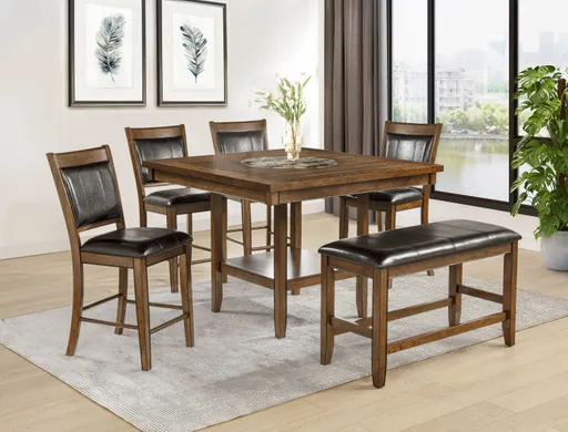 Upgrade your dining space with this luxurious counter height dining set, designed for both style and comfort. The set features a rich dark finish that exudes sophistication, making it a perfect centerpiece for any dining room. The table boasts a spacious, finely crafted top with a beautiful faux plank finish and built-in turntable, supported by a sturdy base that ensures stability and durability. Accompanying the table are four elegant chairs and a versatile bench, all upholstered in plush, black faux leather that provides a sleek, modern look while offering supreme comfort. The padded seats and high backs are designed to enhance your dining experience, making every meal a pleasure. Ideal for both casual family meals and more formal gatherings, this set is sure to make a lasting impression in your home..Upholstered seat Upholstered back Solid wood legs