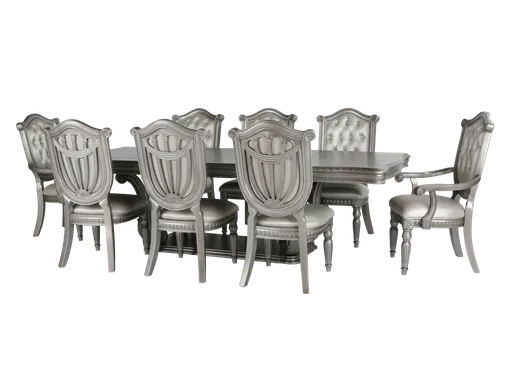 Turn every meal into an occasion with this 9-piece glam silver formal dining set. The rectangular trestle table features a sculpted double pedestal base with sweeping scrolls and leaf carvings, all finished in a soft metallic silver that catches the light without feeling too flashy. A patterned wood-grain top and decorative edge molding add rich traditional detail, while extension leaves (if included with your SKU) allow you to expand the table for holidays and special gatherings.