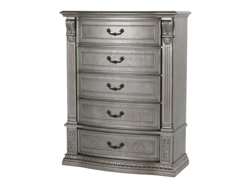 Crafted from solid Poplar Wood and Ash Veneers, this 5 drawer chest boasts expert craftsmanship and a platinum finish that accentuates intricate details on the top. Traditional style blended with modern silver-gray finishes gives the spotlight to the character of the wood, allowing the room to radiate an old-fashioned air of welcome.