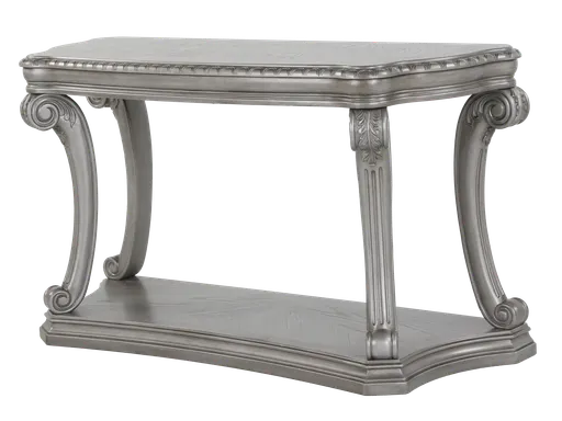 Add a touch of luxury and sophistication to any room with our antique platinum sofa table. Featuring wooden floral legs and an open bottom shelf, this stylish accent table adds ample storage and display space. Its captivating design will make it the centerpiece of any traditional or modern space.