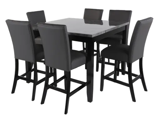 Transform your dining space with this sophisticated square dining room set. The centerpiece is a robust table featuring a dark, faux marble table top that exudes contemporary elegance. Supported by a sturdy black base, this table promises durability and style. Surrounding the table are six plush chairs, upholstered in soft grey fabric for ultimate comfort. Each chair is designed with sleek black legs that perfectly complement the table’s base, creating a cohesive and stylish look. Ideal for both intimate dinners and lively gatherings, this dining room set is sure to be the focal point of your home decor.