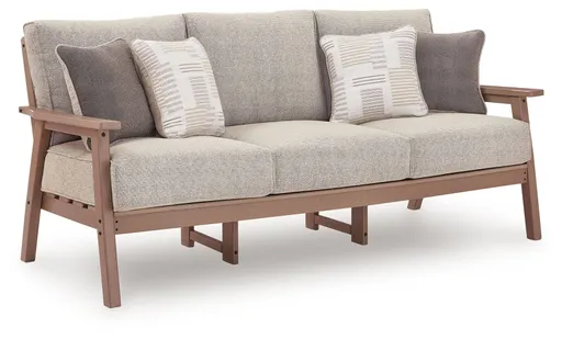 Natural neutrals are all the rage. Embrace the style trend with this outdoor sofa. Crafted with MEGA-TUFF® HDPE material, this chair combines the exceptional durability and weather resistance you need with the wood look you love. Comfy cushions wrapped in our high-performing, low-maintenance Nuvella® fabric offer stylish and durable appeal, taking outdoor living to a whole new level. Coordinating accent pillows add a wonderful layer of interest.