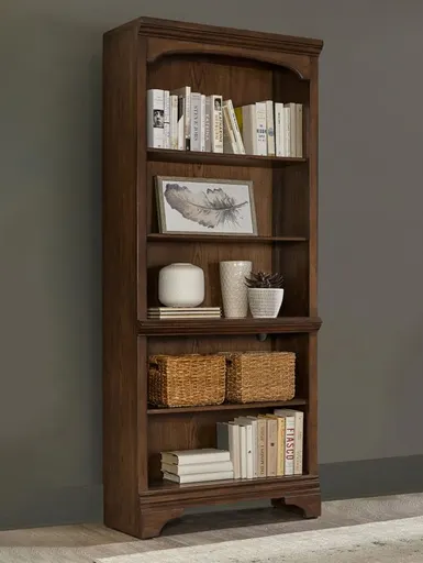 A traditional style bookcase is an elegant addition to offices and home libraries. This piece features five roomy shelves with plenty of space to arrange your favorite novels. Elegant detailing includes a stacked design on the top of the frame with a curved top. This piece is beautifully finished in burnished oak. It's supported on bracket style legs to bring stability.