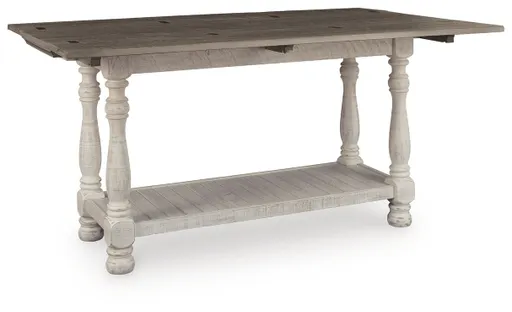 With its richly rustic finish and textural mix, the Havalance flip-top sofa table goes to town on bygone beauty. Its distressed two-tone treatment blends a weathered gray with vintage white for an utterly charming effect. Expecting company? Simply open the flip-top panels to instantly create an impromptu dining space.Additional Dimensions