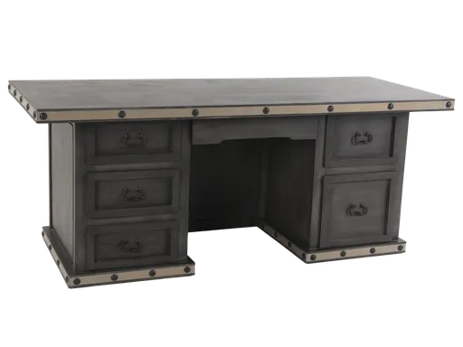 Upgrade your workspace with this striking Industrial Gray Executive Desk, expertly crafted for both style and function. Featuring a robust wood frame in a distressed gray finish, this desk is accented with riveted metal trim for a bold, industrial look. It offers six spacious storage drawers—three on the left, two on the right, and a wide center drawer—perfect for organizing office supplies, files, and paperwork. Sturdy black hardware and classic handles complete the sophisticated, rugged design. With ample surface area for your computer, documents, and décor, this desk is perfect for any home office or executive setting, blending durability with modern industrial style.