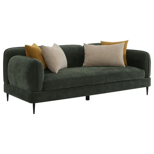 Elevate your living space with the perfect blend of style, comfort, and functionality with this modern sofa. Its sculpted round shapes and bench waterfall seat cushion create a harmonious and inviting look, enhancing any room's aesthetic. The textured chenille fabric provides an incredibly soft touch, adding a layer of luxury and durability to this standout piece. The rich green hue is perfectly complemented by vivid yellow and neutral beige accent pillows, bringing a pop of color and a touch of elegance. Supported by thin, tall metal legs, this sofa not only looks light and airy but also adds a modern touch to your home decor.