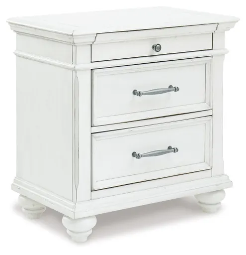 Give your retreat vintage charm and valuable bedside storage with this nightstand. In a beautifully distressed whitewash finish, two drawers and a smaller top accessory drawer will help you keep bedtime essentials nearby in casual style. Generously scaled moulding from top to bottom, along with bun feet and drawer handles with a transitional aesthetic, give this nightstand character—evoking the feel of a quaint cottage escape.