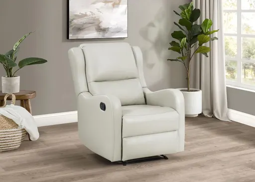 Kick up your feet in style with a graceful modern recliner in your living room or den. It’s a versatile design that pairs clean, sleek lines with English arms that slope beautifully to create refined aesthetics in your home. The recliner features faux leather upholstery in neutral ivory, offering smooth, supple style and elegance. The recliner is complete with foam cushions, providing enduring support and comfort, perfect for lounging and relaxation. Smooth and sleek, this contemporary recliner is at home in both relaxed and more formal living spaces.