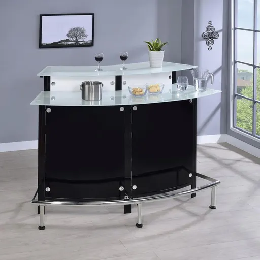 Entertain in sleek sophistication with this modern home bar, featuring a curved silhouette, chrome accents, and glossy black and white acrylic panels. Dual-tiered frosted glass tops offer ample space for mixing and serving, while the metal footrest invites guests to sit back and enjoy the experience. Designed to impress in any lounge or entertaining space.