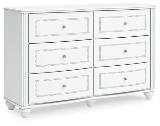 Fit for a princess. This dresser’s crisp matte finish pairs with charming elements like bun feet, crystal knobs and ornate beading—the perfect crowning touches for your girly girl. This spacious six-drawer piece is sure to make your little one feel like royalty.