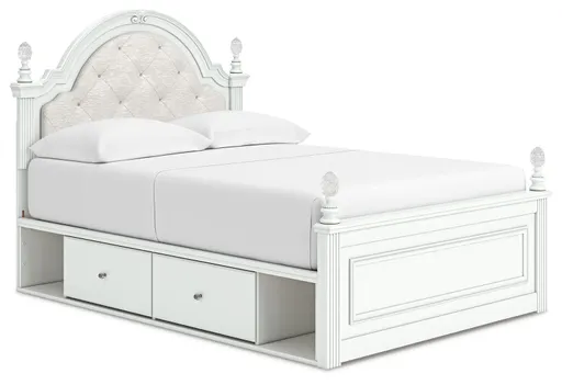 Fit for a princess. This upholstered panel storage bed’s crisp matte finish pairs with charming ornate beading details and sumptuous button-tufted upholstery—perfect for your girly girl. Spacious storage drawers neatly tuck away bedroom essentials, while decorative ball tops and multicolored LED lighting in the headboard are the crowning touches to make your little one feel like royalty.