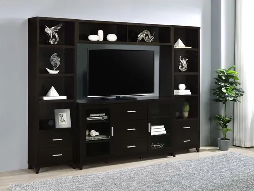 Elevate your living room with this four-piece entertainment center, finished in rich cappuccino for a sleek contemporary look. The 60-inch TV console accommodates televisions up to 60 inches and includes two framed clear tempered glass doors, adjustable shelving, and three drawers for organized storage. Flanking media towers provide additional open shelving for books and decor, along with two drawers each for concealed items. A connecting bridge tops the unit, featuring two enclosed compartments to complete the design. Brushed silver hardware and tapered legs add refined finishing touches.