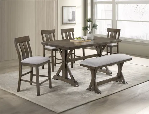 Elevate your dining experience with this beautifully crafted counter-height dining set, where rustic charm meets modern sophistication. Designed to bring warmth and style to any space, the solid wood table features a bold trestle base that exudes farmhouse appeal while providing exceptional stability. The matching counter-height chairs and bench offer a sleek slat-back design and plush upholstered seats, ensuring both comfort and elegance. Perfect for casual meals or entertaining guests, this elevated dining collection creates an inviting atmosphere that blends seamlessly with contemporary, industrial, or rustic interiors.