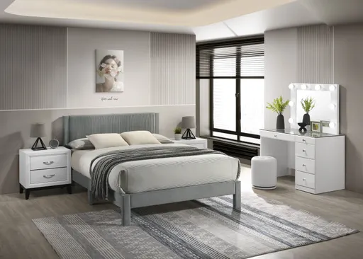 Experience the perfect blend of minimalist design and modern comfort with this elegantly understated bed. Its clean, sharp lines and a sophisticated gray finish create a serene and stylish foundation for any contemporary bedroom. The bed features a streamlined silhouette with a plush, upholstered headboard that boasts a tastefully ribbed texture, providing both visual interest and a comfortable surface to lean against while reading or relaxing. The low-profile frame, supported by sturdy, unobtrusive legs, underscores its sleek, modern appeal, making it an ideal choice for those who prefer a clutter-free aesthetic.. Complete bed frame in one box Velvet upholstery Ribbed headboard detail