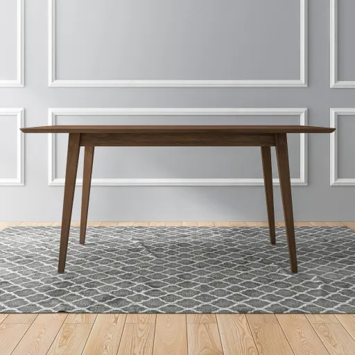 Mid-Century Modern Design: Features a stylish and timeless design inspired by mid-century aesthetics. Solid Wood Construction: Crafted from high-quality solid wood for durability and sturdiness. Seats Four-Six Comfortably: Accommodates a group of four to six people comfortably for meals and gatherings. Stain Finish: Finished in a rich stain that adds warmth and elegance to any dining space. Beveled Edges: Designed with beveled edges for a sleek and polished look.