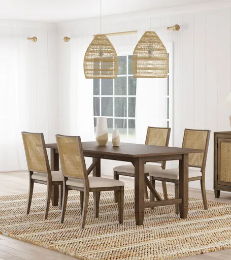 Create a soothing, relaxed ambiance in your welcoming dining room with a transitional five-piece dining set. The set centers on a rectangular table crafted in rubberwoods and graced with a warm, neutral brown finish. Angular support details add trestle-inspired style for a hint of farmhouse flair to the table, which includes an extension leaf for guests. Four side chairs are included, each boasting a matching wooden frame with a plush padded seat in neutral beige upholstery. Rectangular seat backs add rattan, bringing airy appeal and casual character in a kitchen or dining room.Includes: One (1) dining table and four (4) side chairs• Clean lines and a mix of textures infuse character into a transitional five-piece dining set • Warm, natural brown wood grain finish pairs with a trestle-style table base • Charis features rattan backs in a light brown finish that creates warmth and engaging flair • Seats include plush foam padding and neutral beige upholstery fabric for a versatile look • Table includes an 18-inch extension leaf that's ideal for larger spaces, families, and entertainingDimensionsDining Table: 76.0" x 40.0" x 30.0", Weight: 169.71, MaxWidth: 94.0Side Chair: 20.25" x 24.5" x 37.0", SeatHeight: 19.5, SeatWidth: 20.25, SeatDepth: 19.0, Weight: 13.05