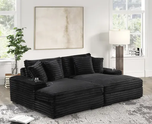 Sink into cloud-soft comfort with this oversized black double chaise lounge. Wrapped in ultra-plush, channel-tufted upholstery, this low-profile design gives you extra-deep seating that’s perfect for movie nights, afternoon naps, or lounging with the whole family.
