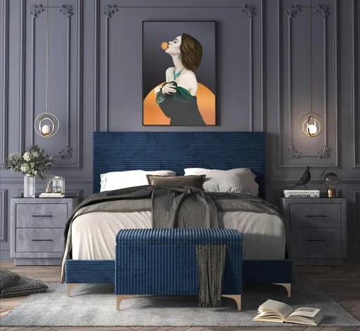 Elevate your bedroom with the Midnight Blue Velvet Queen Bed Set, a perfect blend of modern glamour and plush comfort. Wrapped in rich ribbed blue velvet upholstery, this set features a streamlined padded headboard, low-profile frame, and elegant gold metal legs that add a touch of luxury.