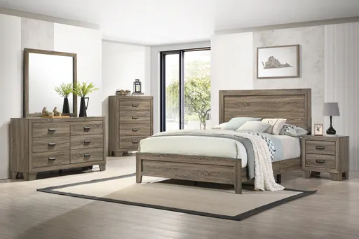 This bedroom set offers a minimalist design with a nod to rustic aesthetics, perfect for creating a serene and uncluttered space. The straightforward lines of the bed frame, combined with the natural wood finish, exude a sense of calm and earthiness. The accompanying pieces, including a simple dresser with a matching mirror, a functional chest, and a streamlined nightstand, are all characterized by their clean profiles and understated hardware. This collection is designed for practicality and durability, with ample storage options that cater to a hassle-free, organized lifestyle. .Kenlin drawer guides Dovetail drawer construction Woodgrain finish Dimensions: Depth: 16.4 (inch), Height: 23.6 (inch), Width: 31.5 (inch), Weight: 40.7 (lb)