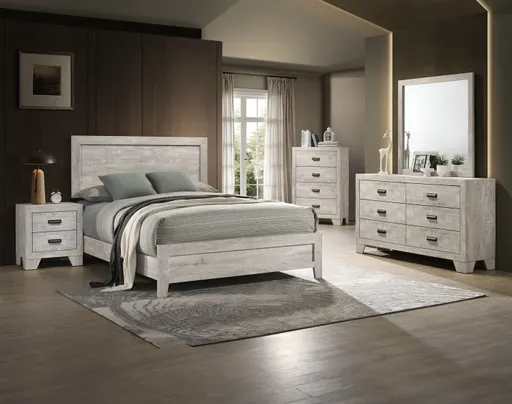 This bedroom set offers a minimalist design with a nod to rustic aesthetics, perfect for creating a serene and uncluttered space. The straightforward lines of the bed frame, combined with the whitewashed wood finish, exude a sense of calm and earthiness. The accompanying pieces, including a simple dresser with a matching mirror, a functional chest, and a streamlined nightstand, are all characterized by their clean profiles and understated hardware. This collection is designed for practicality and durability, with ample storage options that cater to a hassle-free, organized lifestyle. .Kenlin drawer guides Dovetail drawer construction Woodgrain finish Dimensions: Depth: 16.4 (inch), Height: 23.6 (inch), Width: 31.5 (inch), Weight: 40.7 (lb)