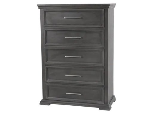 Add style and function to your bedroom with this modern 5-drawer gray chest, designed to provide ample storage while maintaining a sleek, timeless look. Crafted from durable wood and finished in a rich gray tone, this chest features clean lines, framed drawer fronts, and contemporary metal bar pulls for a refined touch.