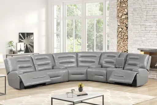 Refresh your living room with this modern power reclining sectional, beautifully upholstered in elegant gray top grain leather for a sleek and sophisticated look. This spacious sectional features plush, channel-tufted backrests and supportive cushioning, delivering exceptional comfort for you and your guests. With dual power recliners at each end, you can effortlessly find your perfect lounging position at the touch of a button. A convenient storage console and integrated cup holders keep essentials close by, making it ideal for movie nights or entertaining. Durable top grain leather upholstery ensures long-lasting style and easy maintenance, while the expansive L-shaped design maximizes seating for family and friends.
